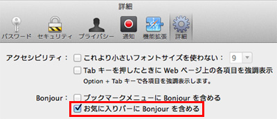 - Bonjour欄の「お気に入りバーにBonjourを含める」にチェックマークを付けて、画面を閉じます。